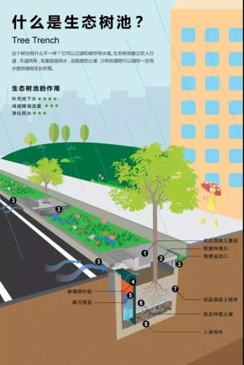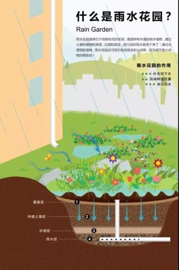 海绵设施:雨污分流管道、雨水花园、植草沟